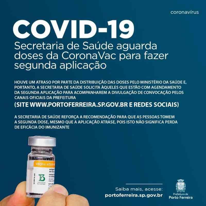 Houve um atraso por parte da distribuição das doses pelo Ministério da Saúde e, portanto, a Secretaria de Saúde solicita àqueles que estão com agendamento da segunda aplicação para acompanharem a divulgação de convocação pelos canais oficiais da Prefeitura (site www.portoferreira.sp.gov.br e redes sociais).