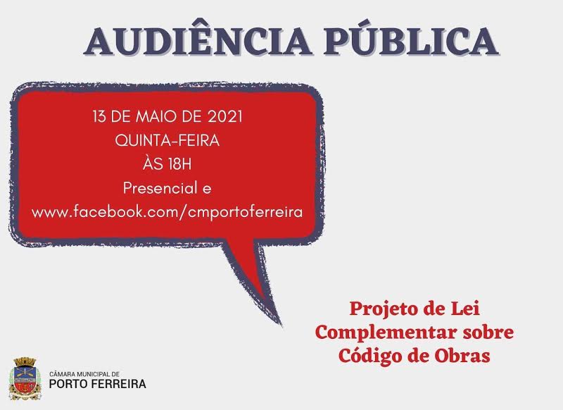 A Câmara Municipal de Porto Ferreira fará audiência pública, na próxima quinta-feira (13/05), às 18h, para a apresentação e discussão do Projeto de Lei Complementar nº 06/2021 que cria e altera dispositivos normativos da Lei Complementar nº 232/2020 que versa sobre o Código de Obras em Porto Ferreira.