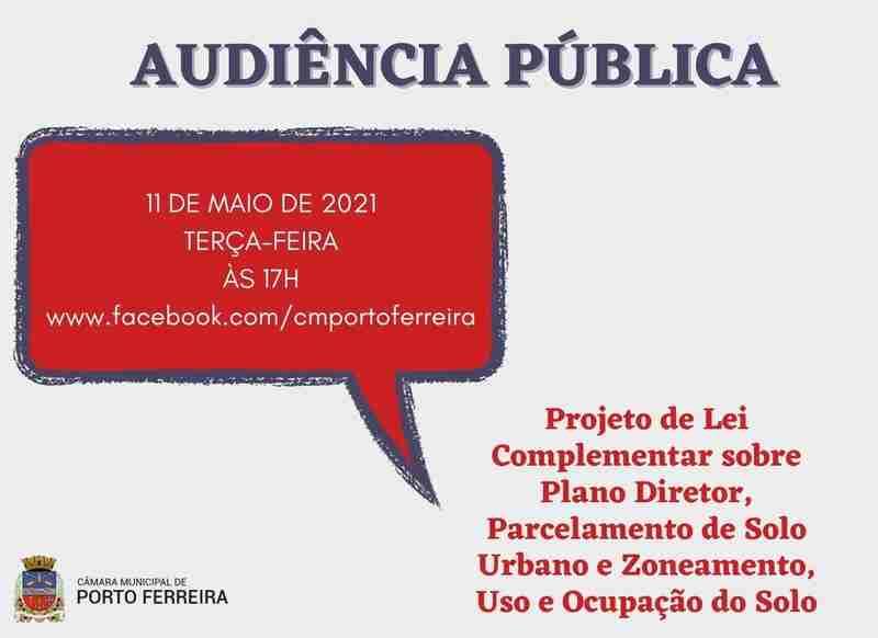 Nesta terça-feira (11/05), a partir das 17h, a Câmara Municipal de Porto Ferreira realiza audiência pública online para discussão do Projeto de Lei Complementar nº 08/2021, de autoria do Poder Executivo Municipal.