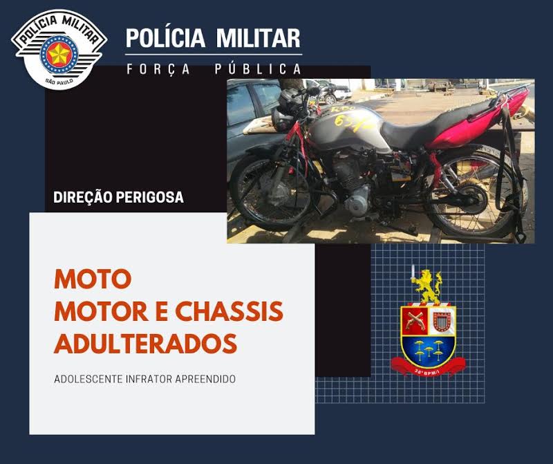 O menor recebeu voz de apreensão, sendo levado para a Delegacia de Polícia para lavratura de Boletim de Ocorrência e demais providências. A motocicleta foi apreendida, onde passará por perícia para a verdadeira identificação do proprietário.
