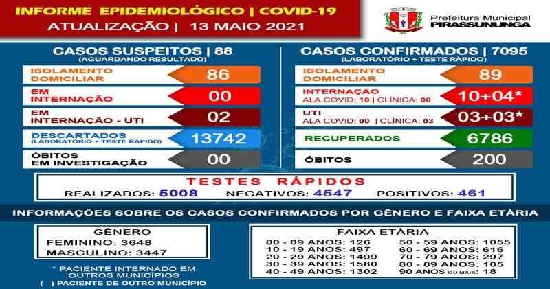 Pirassununga registrou, na tarde desta quinta-feira (13/05), mais 3 mortes por Covid-19 e 19 novos casos foram confirmados de acordo com boletim oficial epidemiológico da Vigilância Epidemiológica do município.