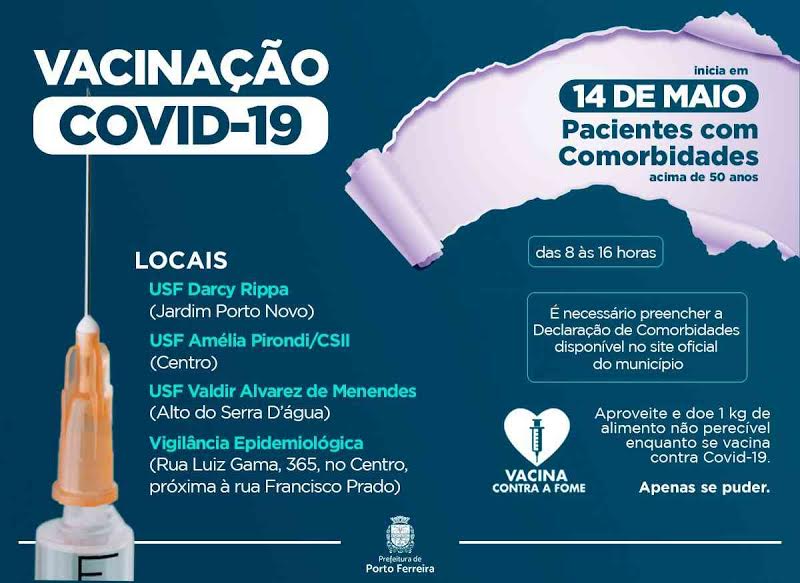 A Secretaria de Saúde de Porto Ferreira, por meio da Vigilância Epidemiológica, informa que iniciará a vacinação contra a covid-19 no público com idade de 50 a 54 anos portador de comorbidade nesta sexta-feira (14/05), no horário das 8h às 16h.