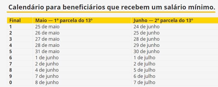 A primeira parcela do décimo terceiro do Instituto Nacional de Seguro Social (INSS) começará a ser paga no próximo dia 25. Antecipado para maio, devido a pandemia da Covid-19, os depósitos ocorrerão até 8 de junho. A segunda parcela será paga entre 24 de junho e 5 de julho.