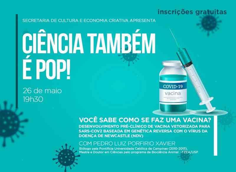 A Secretaria de Cultura e Economia Criativa de Porto Ferreira apresenta o tema do projeto Ciência Também É Pop! que acontece nesta quarta-feira (26/05), às 19h30: “Você sabe como se faz uma vacina? – DESENVOLVIMENTO PRÉ-CLÍNICO DE VACINA VETORIZADA PARA SARS-CoV2 BASEADA EM GENÉTICA REVERSA COM O VÍRUS DA DOENÇA DE NEWCASTLE (NDV)”.