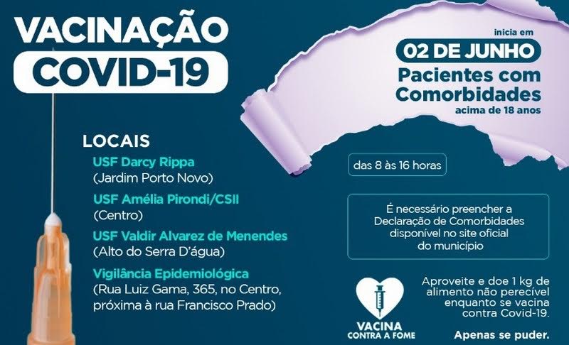 A Secretaria de Saúde de Porto Ferreira, por meio da Vigilância Epidemiológica, informa que iniciará a vacinação contra a covid-19 no público com idade acima de 18 anos portador de comorbidade nesta quarta-feira (02/06), no horário das 8h às 16h.