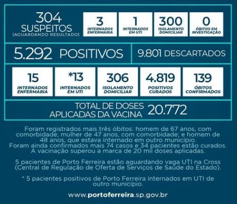 Porto Ferreira – Boletim Covid nº 415: 1º dia de junho já começa com 3 óbitos e 74 casos confirmados