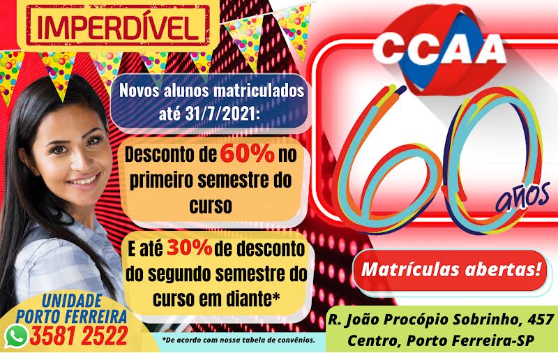 O CCAA Porto Ferreira já abriu matrículas para o segundo semestre de 2021 com preços super especiais. Todos os novos alunos terão 60% de desconto no primeiro semestre de seus cursos e 20% ou 30% de desconto do segundo semestre em diante, até a conclusão de seus estudos, de acordo com a tabela de convênios da escola. O CCAA possui mais de 125 estabelecimentos conveniados em Porto Ferreira, incluindo faculdades, órgãos públicos, escolas e empresas. Atenção: preços especiais de aniversário válidos até 31/07/2021.
