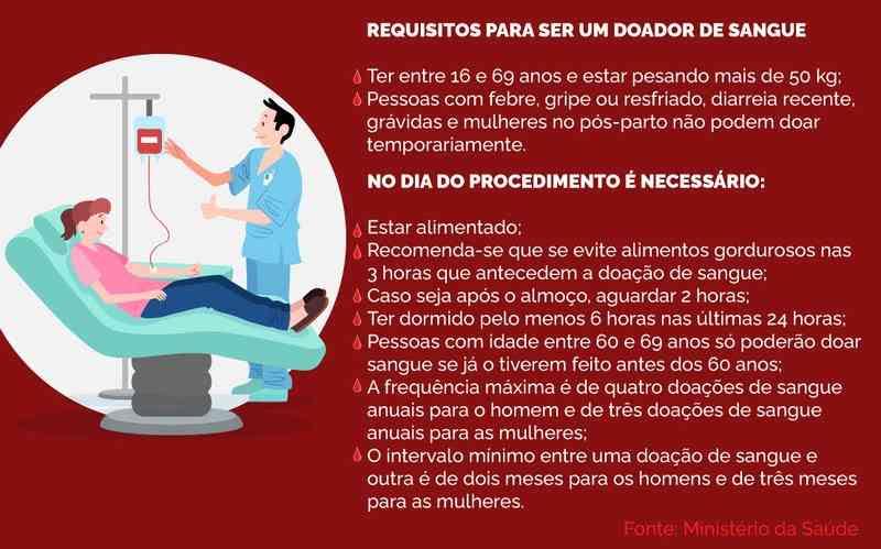 Para doar sangue é necessário ter entre 16 e 69 anos, sendo que menores de idade precisam da autorização de um responsável legal, pesar no mínimo 50 quilos e estar em boas condições de saúde.