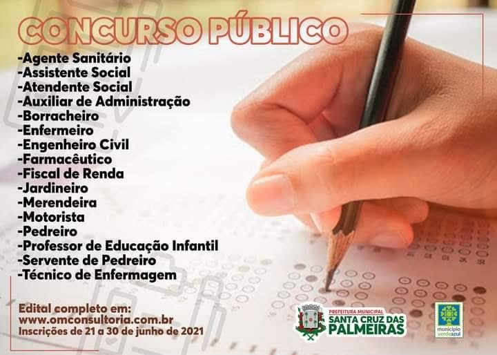 No estado de São Paulo, a Prefeitura de Santa Cruz das Palmeiras divulgou um novo edital de Concurso Público a fim de contratar 16 profissionais de níveis fundamental, médio, técnico e superior.