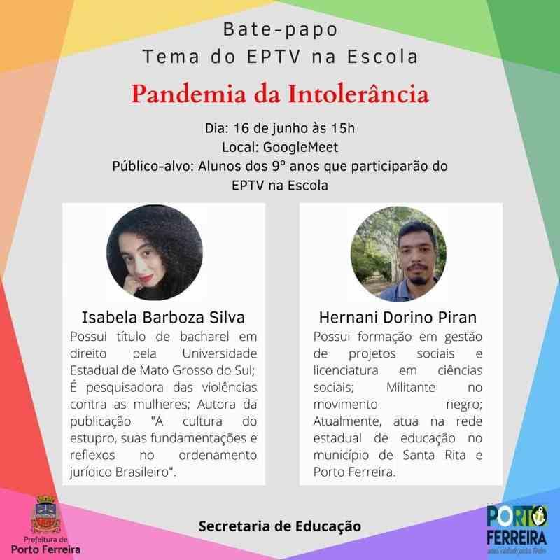 A Secretaria de Educação de Porto Ferreira vai realizar nesta quarta-feira (16/06) um momento de bate-papo entre os alunos dos 9º anos que participarão do projeto EPTV na Escola, cujo tema escolhido para 2021 é “Pandemia da Intolerância”.