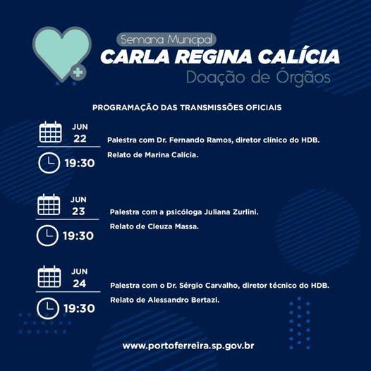 A Prefeitura de Porto Ferreira, por meio da Secretaria de Saúde, realiza nos dias 22, 23 e 24 de junho (terça a quinta-feira da semana que vem) a 2ª Semana Carla Regina Calícia, em conscientização e incentivo à doação de órgãos. O evento será transmitido de forma online, no perfil oficial da Prefeitura, no Facebook e no YouTube, a partir das 19h30, e está aberto para todo público.
