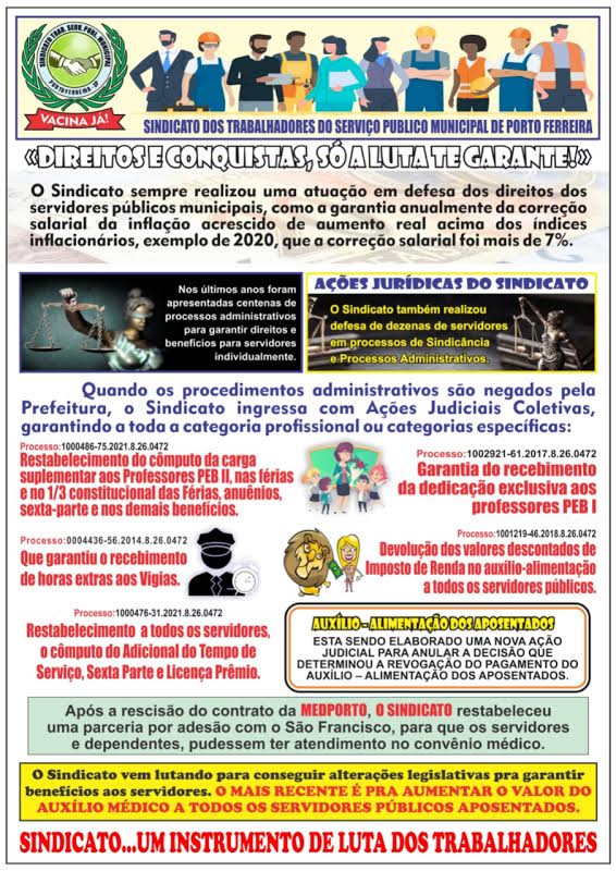 O Sindicato sempre realizou uma atuação em defesa dos direitos dos servidores públicos municipais, como a garantia anualmente da correção salarial da inflação acrescido de aumento real acima dos índices inflacionários, exemplo 2020, que a correção salarial foi mais de 7%.