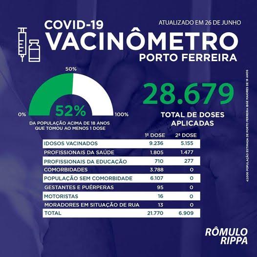 A Prefeitura de Porto Ferreira, através da Secretaria de Saúde e por meio da Vigilância Epidemiológica, informa que suspenderá nesta segunda-feira (28/06) a aplicação de doses da vacina contra a covid-19 nas quatro Unidades de Saúde que estão sendo usadas para a campanha (duas no Centro, uma no Jardim Porto Novo e uma no Alto do Serra D’água).
