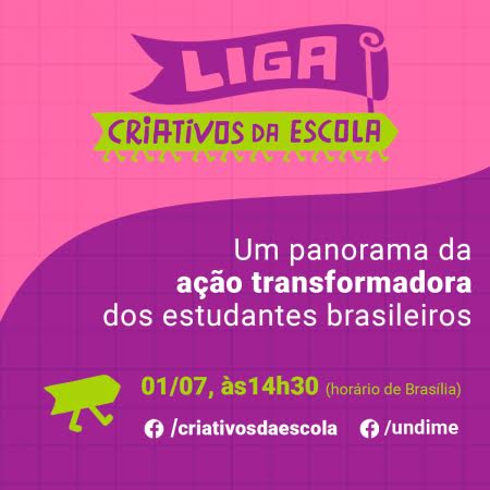No dia 01/07, o programa Criativos da Escola, do Instituto Alana, lança a Liga Criativos da Escola, em parceria institucional com a União Nacional dos Dirigentes Municipais de Educação (Undime). A Liga é resultado de um estudo exclusivo e inédito sobre como estudantes e educadores de todo país estão transformando suas escolas e comunidades desde 2015. Para contar sobre a iniciativa, será realizada uma transmissão ao vivo de lançamento no dia 01 de julho (quinta-feira), às 14h30 (horário de Brasília), pelo Facebook do Criativos.