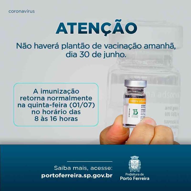 A Secretaria de Saúde de Porto Ferreira, por meio da Vigilância Epidemiológica, informa que suspenderá nesta quarta-feira (29/06) a aplicação de doses da vacina contra a covid-19 nas quatro Unidades de Saúde que estão sendo usadas para a campanha (duas no Centro, uma no Jardim Porto Novo e uma no Alto do Serra D’água).