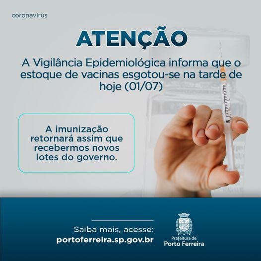 A Secretaria de Saúde de Porto Ferreira, por meio da Vigilância Epidemiológica, informa que suspendeu na tarde desta quinta-feira (01/07) a aplicação de doses da vacina contra a covid-19 nas quatro Unidades de Saúde que estão sendo usadas para a campanha (duas no Centro, uma no Jardim Porto Novo e uma no Alto do Serra D’água).