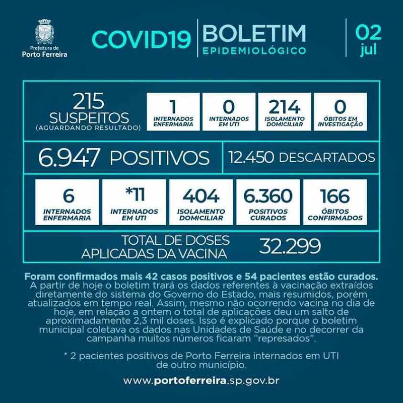 A Vigilância Epidemiológica da Secretaria de Saúde de Porto Ferreira divulgou nesta sexta-feira (02/07) o Boletim Epidemiológico nº 446/2021, atendendo à determinação prevista no decreto municipal 1.281/2020.