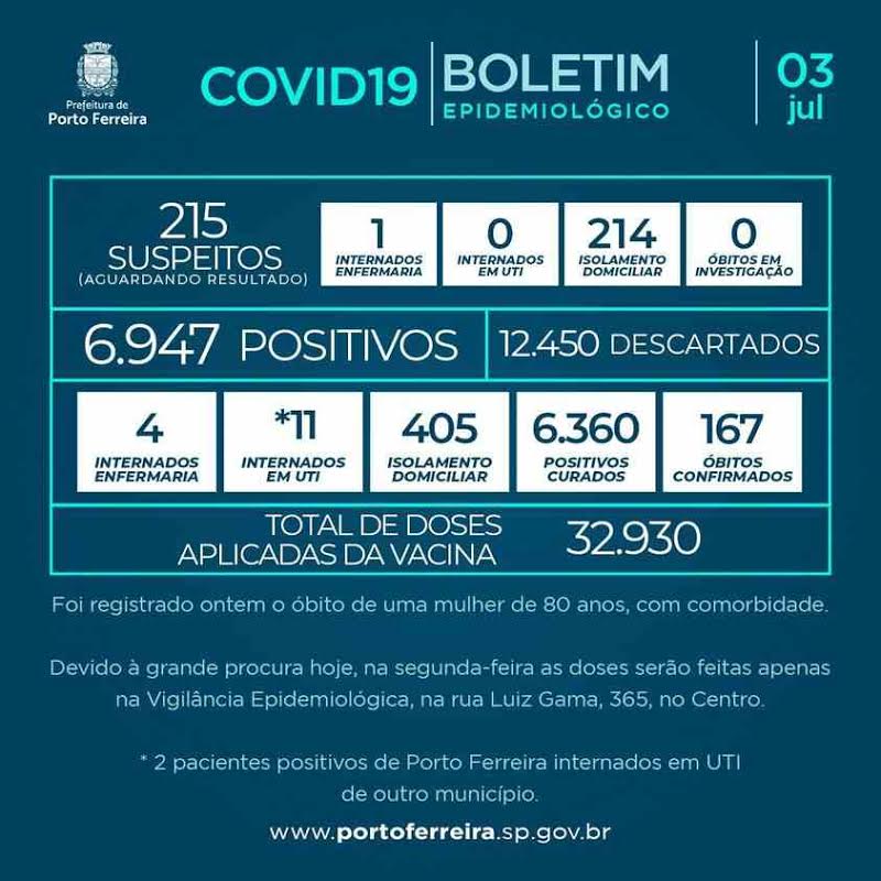 A Vigilância Epidemiológica da Secretaria de Saúde de Porto Ferreira divulgou neste sábado (03/07) o Boletim Epidemiológico nº 447/2021, atendendo à determinação prevista no decreto municipal 1.281/2020.