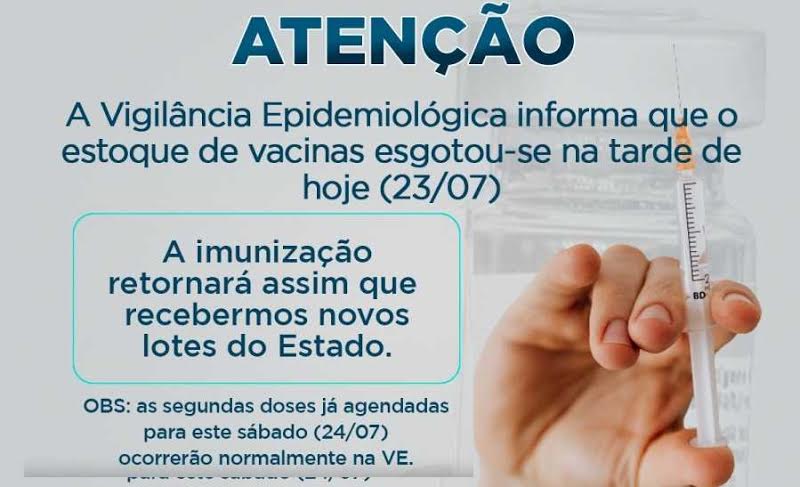A Secretaria de Saúde de Porto Ferreira, por meio da Vigilância Epidemiológica, informa que suspendeu na tarde desta sexta-feira (23/07) a aplicação de doses da vacina contra a covid-19 nas três Unidades de Saúde que estão sendo usadas para a campanha (uma no Centro, uma no Jardim Porto Novo e uma no Alto do Serra D’água).