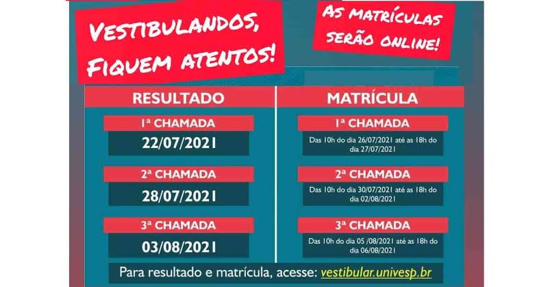O polo da Univesp (Universidade Virtual do Estado de São Paulo) de Porto Ferreira informa que os resultados do vestibular 2021 já estão disponíveis e as matrículas deverão ser realizadas de acordo com o calendário: