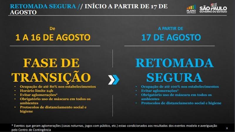 A partir de 17 de agosto, quando essa fase terminar, o governo prevê retirar todas as limitações para funcionamento das atividades do estado, ou seja, não haverá mais limite de ocupação ou de horário.