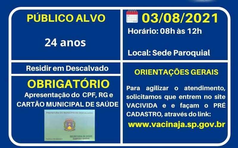 Descalvado fará nesta terça-feira, 03 de agosto, a vacinação contra Covid-19 para as pessoas com idade de 24 anos ou mais na Sede Paroquial, das 8 às 12 horas