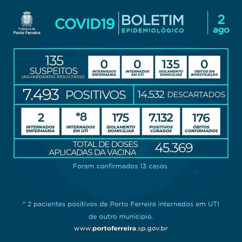 Boletim Covid-19 de Porto Ferreira nº 477: mais 13 casos confirmados e 263 doses de vacina aplicadas