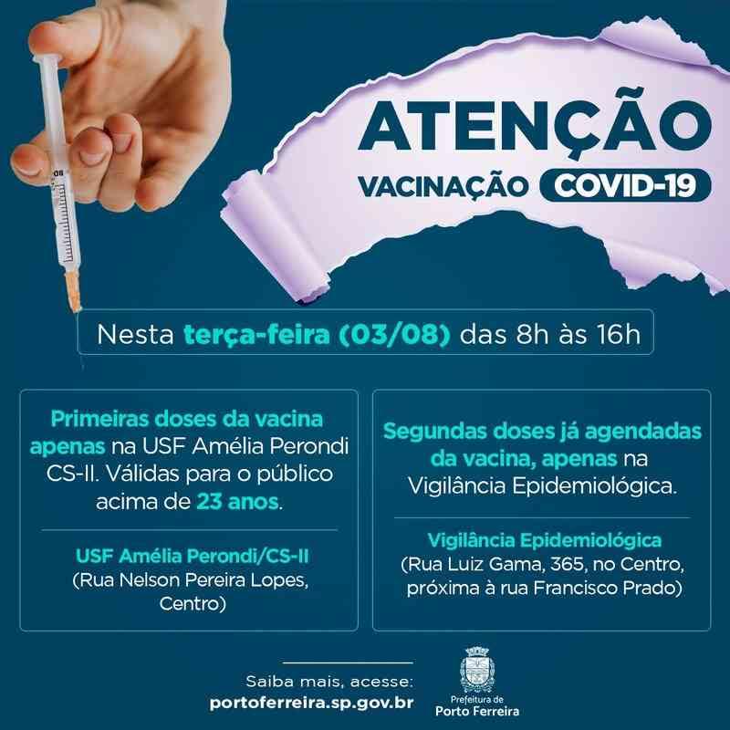 A Secretaria de Saúde de Porto Ferreira, por meio da Vigilância Epidemiológica, informa que continua a vacinação contra a covid-19 nesta terça-feira, no horário das 8h às 16h para: o público com idade de 23 anos ou mais, sem comorbidade, além da 2ª dose para aqueles já agendados.