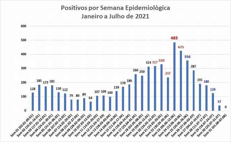 A média de casos positivos por dia em julho também foi a menor desde abril. O último mês apresentou apenas 20,6 casos diários. Maio (41,03) e junho (55,8) registraram os piores números na média de confirmações por dia.