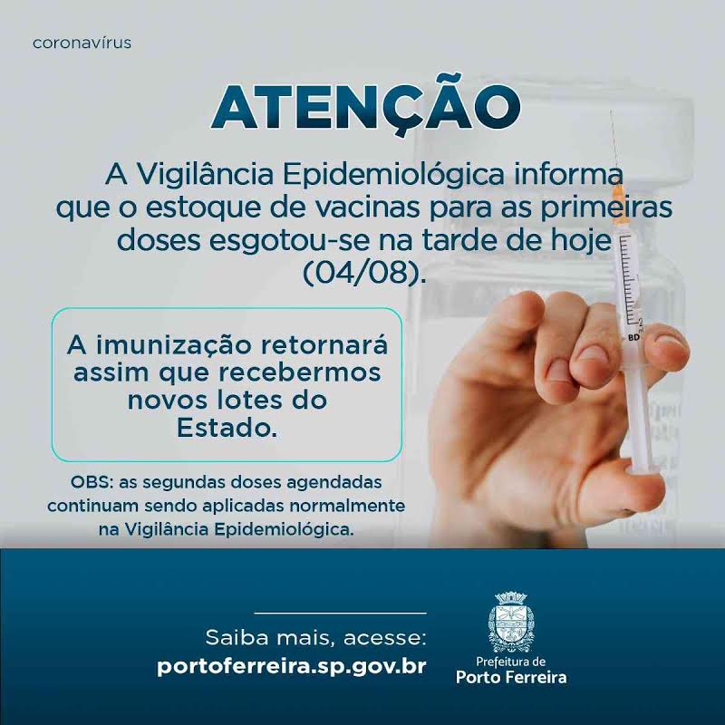 A Secretaria de Saúde de Porto Ferreira, por meio da Vigilância Epidemiológica, informa que suspendeu na tarde desta quarta-feira (04/08) a aplicação de doses da vacina contra a covid-19 nas duas Unidades de Saúde que estavam sendo utilizadas para a campanha hoje (uma no Centro e uma no Jardim Porto Novo).