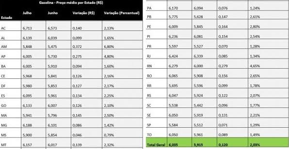 Obtidos por meio do registro das transações realizadas entre os dias 1º e 30 de julho com o cartão de abastecimento da ValeCard em cerca de 25 mil estabelecimentos credenciados, os dados mais recentes mostram que Amazonas (6,8%), Amapá (4,8%) e Rio Grande do Norte (4,65%) registraram as maiores altas no período. As menores variações ocorreram em Mato Grosso do Sul (0,79%) e Pará (1,24%).