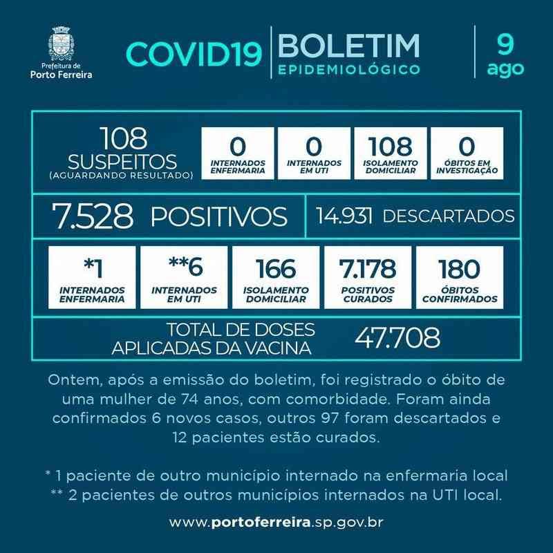A Vigilância Epidemiológica da Secretaria de Saúde de Porto Ferreira divulgou nesta segunda-feira (09/08) o Boletim Epidemiológico nº 484/2021, atendendo à determinação prevista no decreto municipal 1.281/2020.