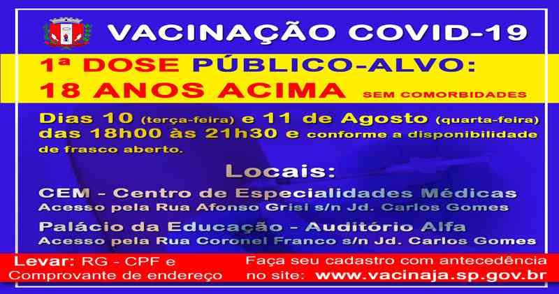 A Prefeitura Municipal de Pirassununga, através da Vigilância Epidemiológica e Imunização, divulgou nesta segunda-feira (9) início de nova etapa, desta vez serão pessoas com 18 anos ou mais sem comorbidades. Segue o banner em anexo com os locais e datas da vacinação.