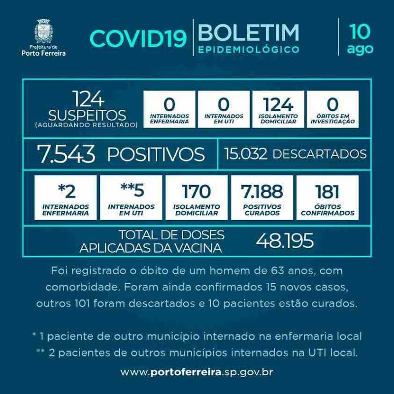 A Vigilância Epidemiológica da Secretaria de Saúde de Porto Ferreira divulgou nesta terça-feira (10/08) o Boletim Epidemiológico nº 485/2021, atendendo à determinação prevista no decreto municipal 1.281/2020.