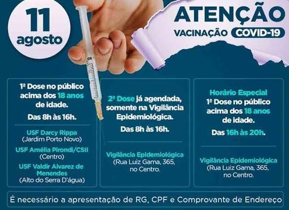 - A unidade da Vigilância Epidemiológica ficará apenas com a aplicação das segundas doses no horário das 8h às 16h.