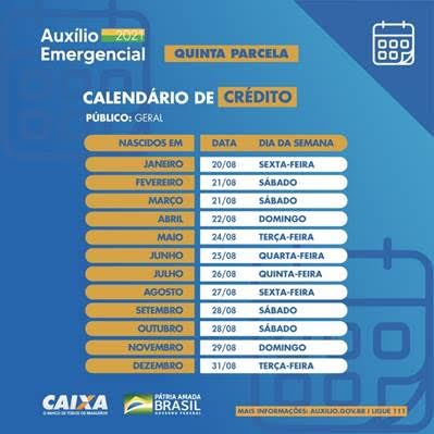 As parcelas extras do Auxílio Emergencial 2021 começarão a ser pagas no dia 20 de agosto para os brasileiros nascidos em janeiro e os demais beneficiários receberão conforme calendário(veja nas imagens acima).