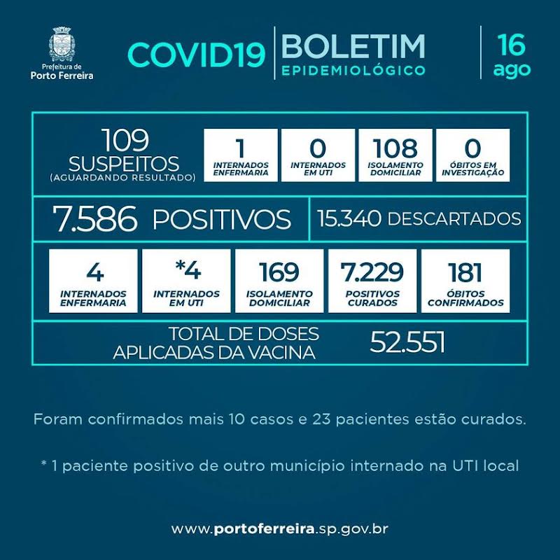 A Vigilância Epidemiológica da Secretaria de Saúde de Porto Ferreira divulgou nesta segunda-feira (16/08) o Boletim Epidemiológico nº 491/2021, atendendo à determinação prevista no decreto municipal 1.281/2020.