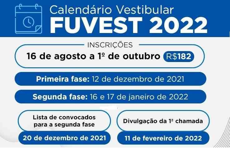 A Fundação Universitária para o Vestibular (Fuvest) deu início nesta segunda-feira, 16 de agosto, as inscrições do seu Vestibular 2022. A taxa é de R$ 182 e o prazo para se cadastrar vai até 1º de outubro.