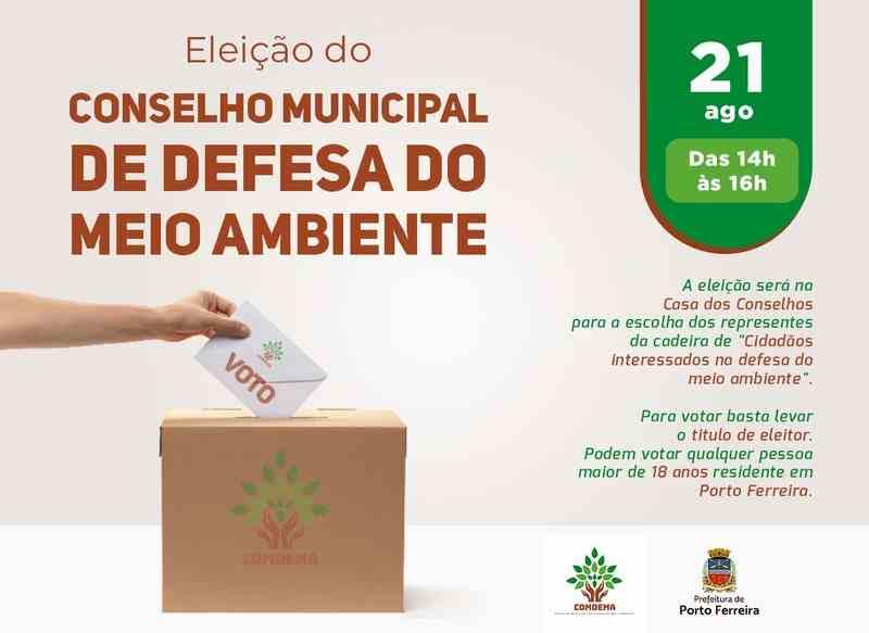 A eleição para a escolha da chapa (titular e suplente) representante da cadeira de “Cidadão interessado na defesa do meio ambiente” no Conselho Municipal de Defesa do Meio Ambiente (Comdema) acontece no sábado (21/08), das 14h às 16h, na Casa dos Conselhos Municipais. Podem votar pessoas residentes em Porto Ferreira, maiores de 18 anos, mediante apresentação de título de eleitor.