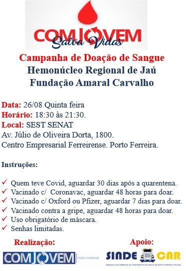 COMJOVEM, promove em Porto Ferreira Campanha de Doação de Sangue para o Hemonúcleo Regional de Jaú ( Fundação Amaral Carvalho).