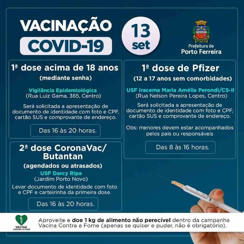 A Vigilância Epidemiológica de Porto Ferreira informa que, devido à não disponibilização de doses da vacina AstraZeneca/Fiocruz pelo Ministério da Saúde – e ainda sem previsão de chegada –, não será realizado plantão de vacinação neste sábado e domingo (11 e 12/09).