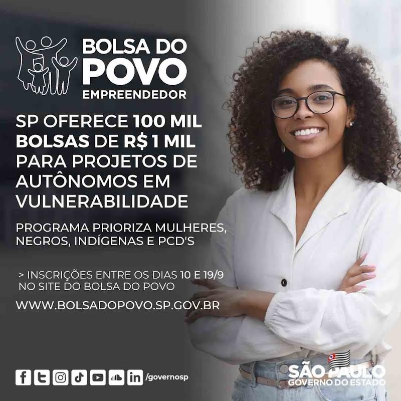 O Governo do estado de SP lançou na sexta-feira (10), o Bolsa Empreendedor, programa com oferta de 100 mil bolsas para autônomos informais em situação de vulnerabilidade, com prioridade para mulheres, jovens entre 18 e 35 anos, pretos e pardos, indígenas e pessoas com deficiência que também vão receber qualificação e migrar para o mercado formal.