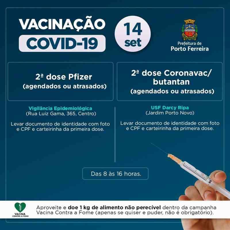 A Vigilância Epidemiológica de Porto Ferreira informa como será o esquema de vacinação contra a covid-19 nesta terça-feira (14/09). Em todos os locais será das 8h às 16h.