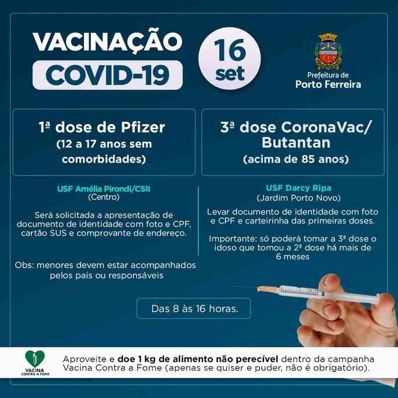 A Vigilância Epidemiológica de Porto Ferreira informa como será o esquema de vacinação contra a covid-19 nesta quinta-feira (16/09). Em todos os locais será das 8h às 16h.