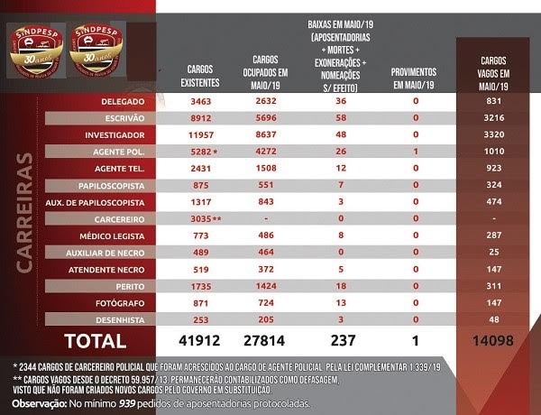 Atualmente, segundo dados do Sindicato dos Delegados de Polícia do Estado de São Paulo (Sindpesp), há o total de 14.960 cargos sem preenchimento na PC SP . A maior carência é para investigador com mais de 3 mil postos em aberto.