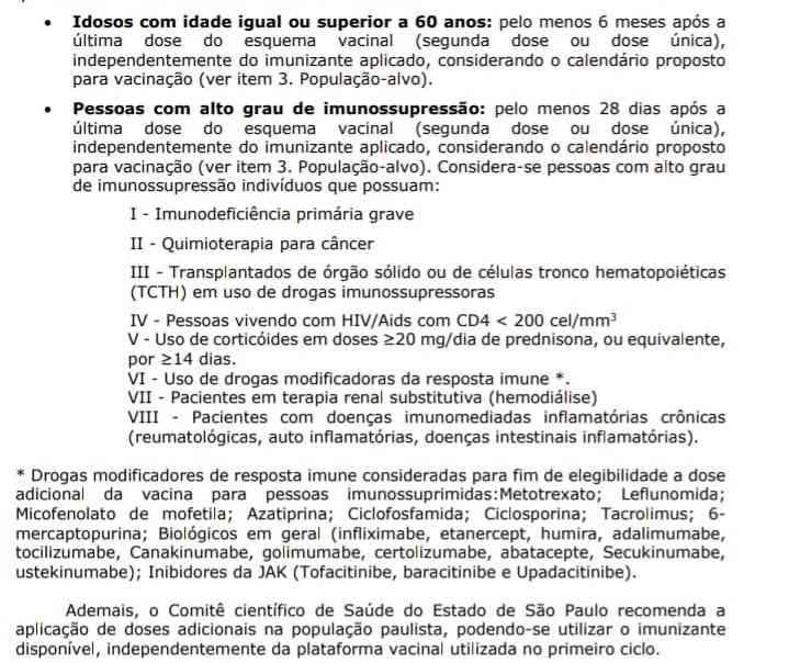 Terá início a aplicação da 3ª dose para pacientes imunossuprimidos que tomaram a 2ª dose há pelo menos 28 dias. Para este público é necessária apresentação de prescrição médica, a fim de identificar a patologia, conforme nota técnica da Secretaria de Saúde do Estado de São Paulo (veja imagem no final).
