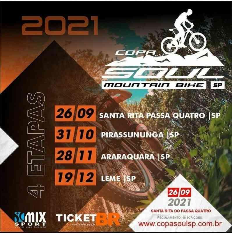 O Município de Santa Rita do Passa Quatro sediará a realização da Copa Soul de Mountain-Bike 2021. O evento, que acontece desde 2013 e é referência na modalidade, com os melhores atletas do país, será realizada no dia 26 de setembro de 2021 pela empresa MX Sports.