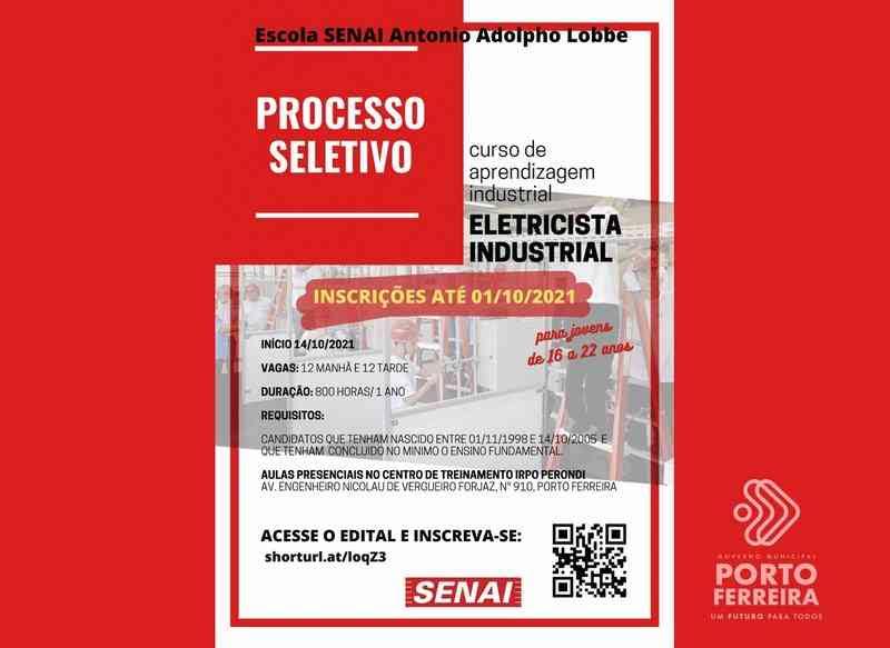 O Senai São Carlos, em parceria com a Prefeitura de Porto Ferreira, por intermédio da Secretaria de Desenvolvimento Econômico e Turismo e Usina Ferrari – Ferrari Agroindústria S.A, abre processo seletivo especial para o Curso de Aprendizagem Industrial – Eletricista Industrial, sendo: