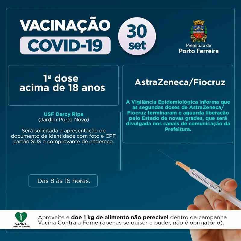 A Vigilância Epidemiológica de Porto Ferreira informa como será o esquema de vacinação contra a covid-19 nesta quinta-feira (30/09), das 8h às 16h.