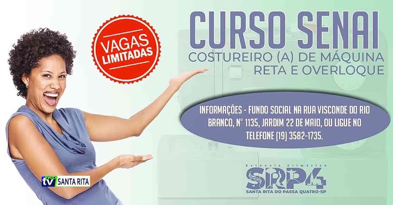 A Prefeitura Municipal de Santa Rita do Passa Quatro, por meio do Fundo Social de Solidariedade e do Senai, oferece 26 vagas para o curso de Costureiro de Máquina Reta e Overloque, com carga horária de 160 horas.